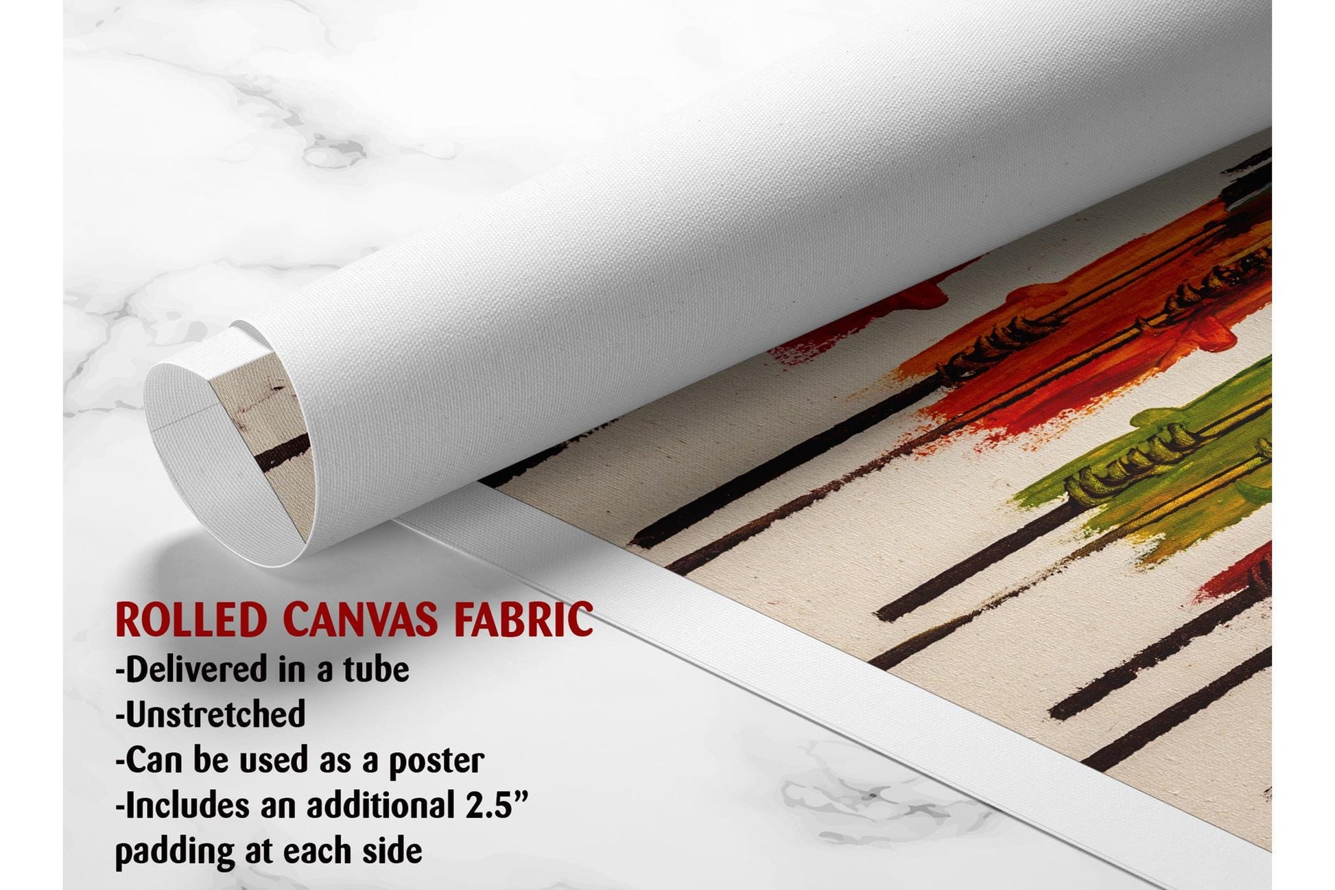 - Rolled canvas print: Shipped rolled in a protective tube with a free 2.5" border, allowing you to stretch and frame it yourself