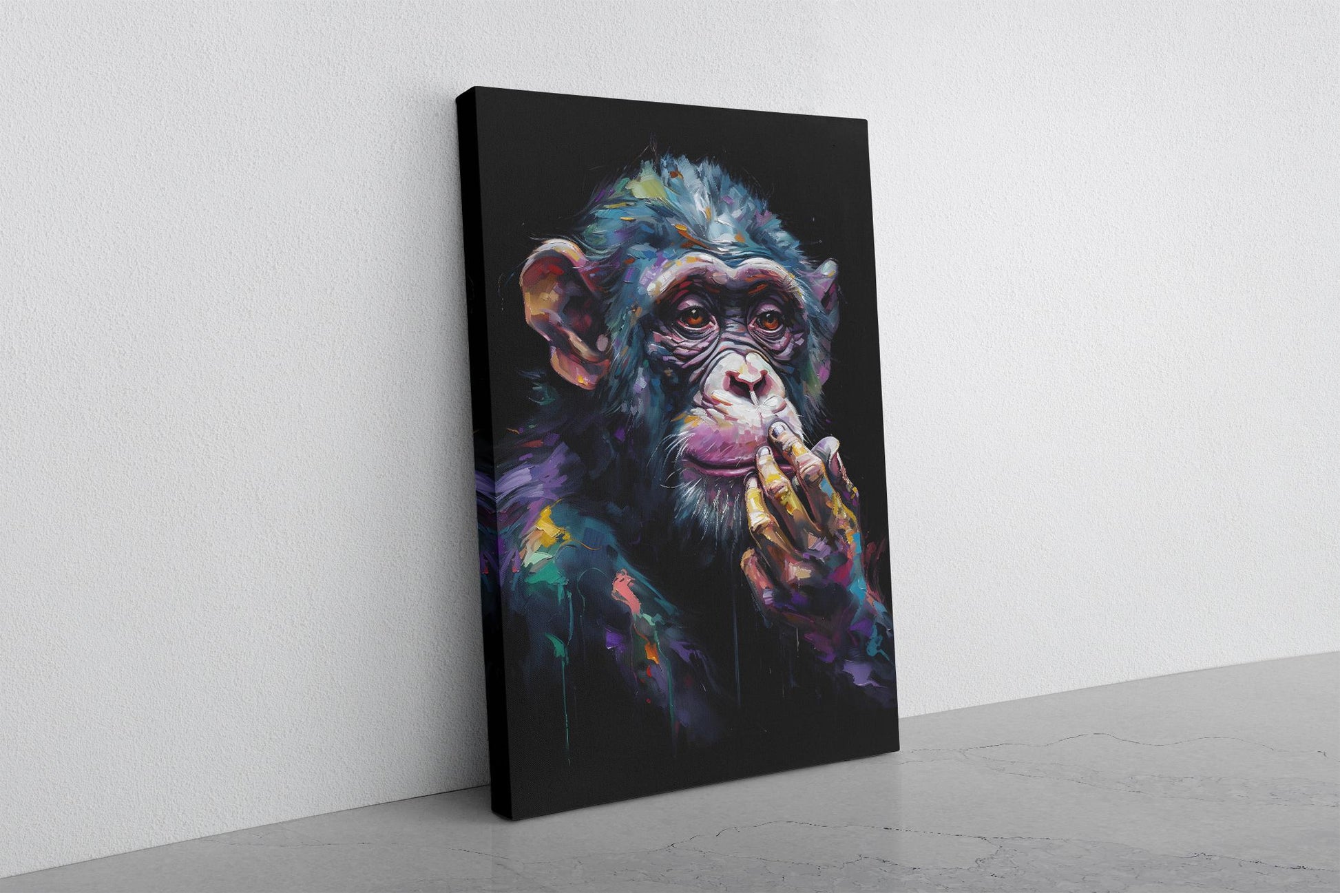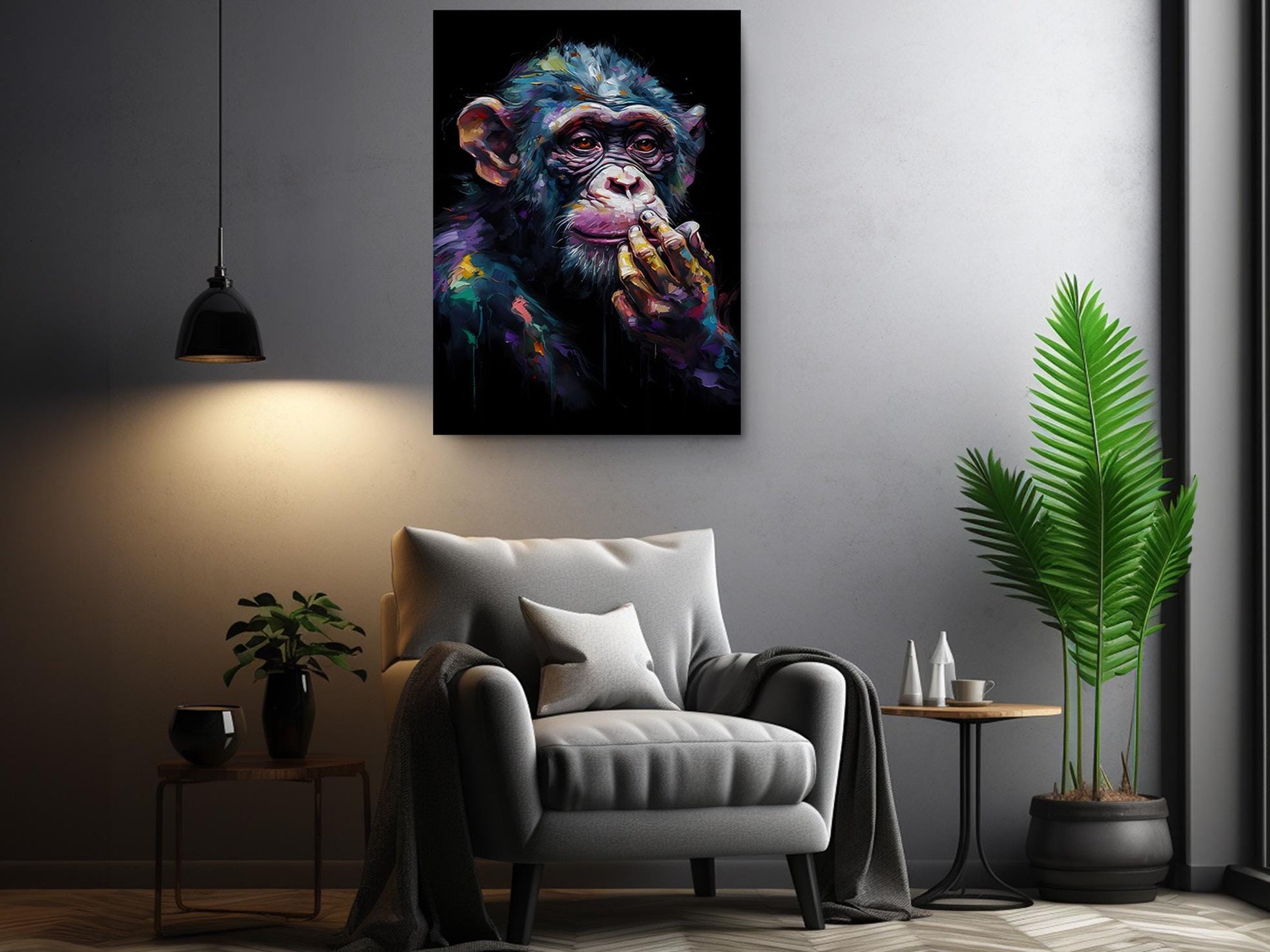The chimpanzee canvas print is a striking piece of modern animal wall art designed to bring vibrant wildlife wall decor into your home or office. This colorful animal print features a detailed, museum quality canvas that captures the essence of contemporary animal art with vivid pigment-based inks. Whether you choose the rolled canvas print or the ready to hang art option, you will enjoy a fade resistant print on artist grade canvas that ensures long-lasting beauty and durability.