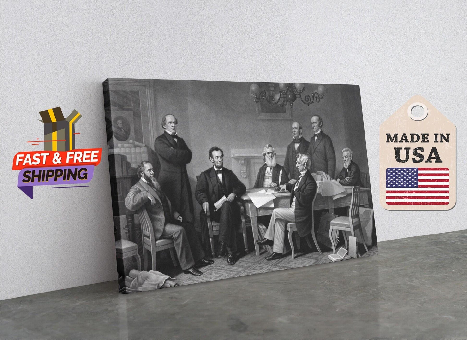 The Emancipation Proclamation print is a museum quality canvas wall art that brings historical significance and patriotic home decor to your living space. This Emancipation Proclamation print features the iconic Library of Congress art, capturing the essence of civil war artwork with exceptional detail and vibrant colors. Perfect for history enthusiasts and collectors, it transforms any room with its rich storytelling and timeless appeal.