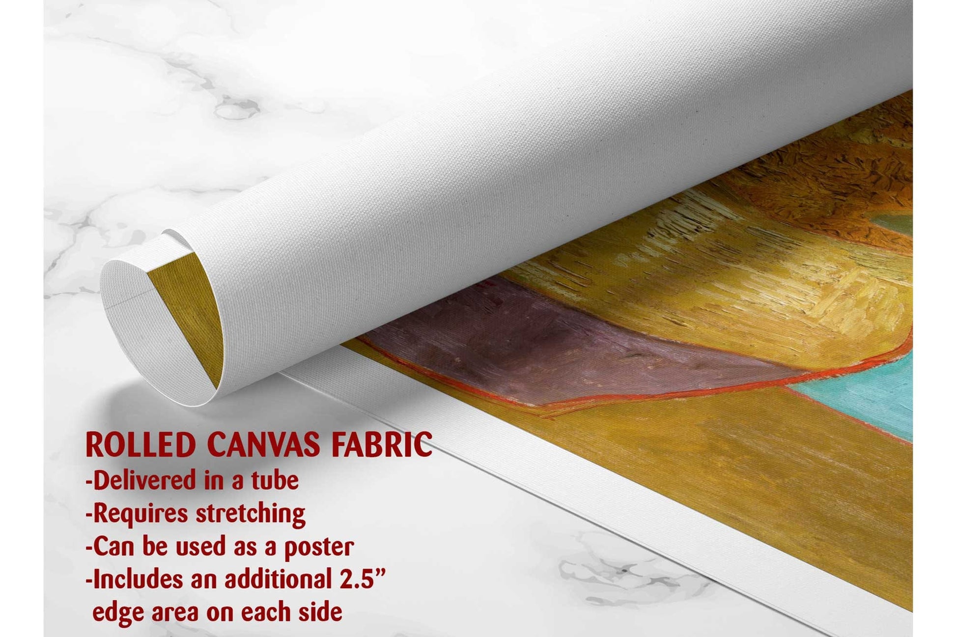 - Rolled Canvas Print: Delivered rolled in a protective tube with a free 2.5" border, perfect for custom framing and stretching.