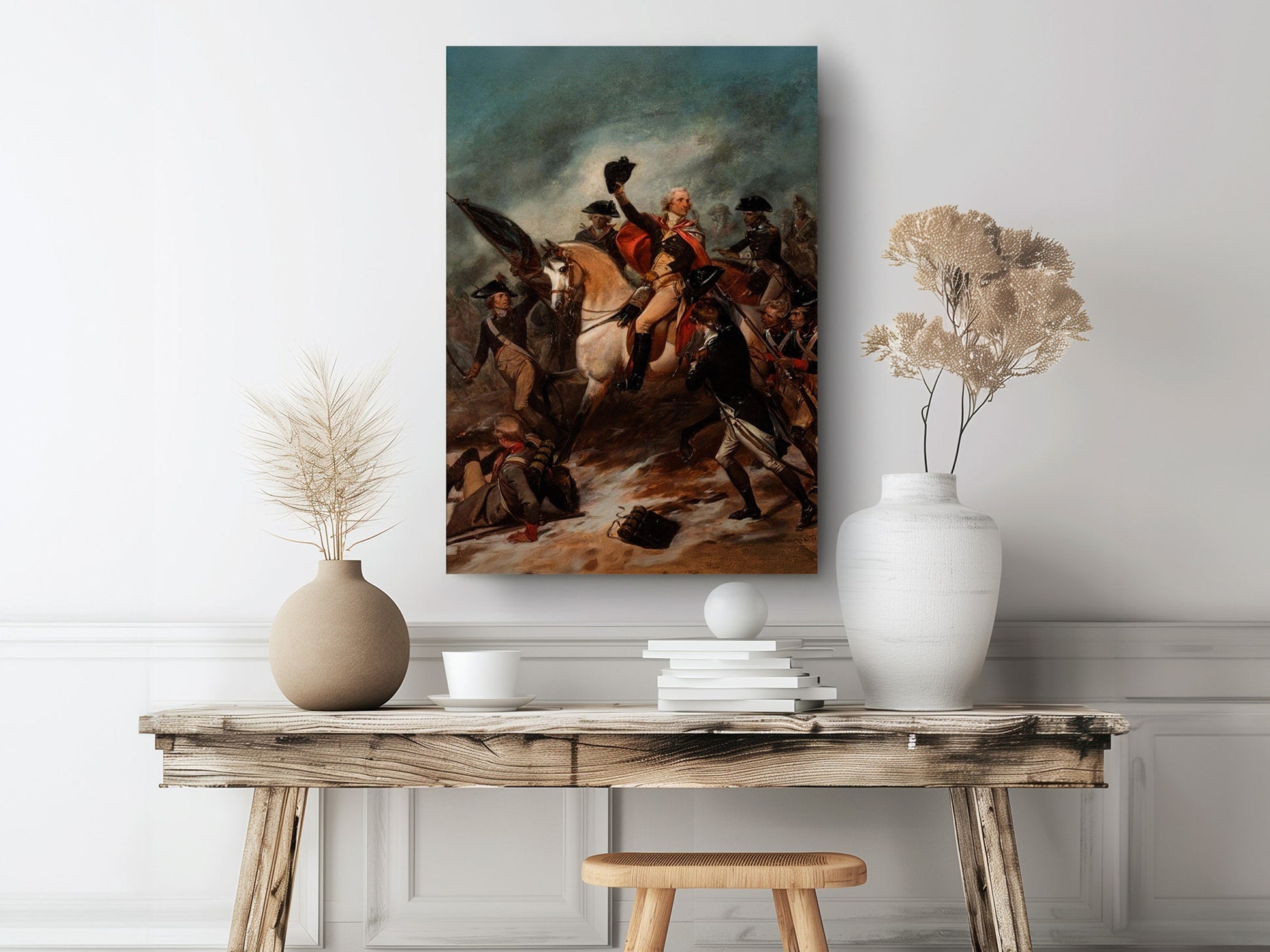 The George Washington canvas print delivers a museum quality reproduction of Alonzo Chappel’s iconic artwork, capturing the historic Princeton moment with vivid detail and lasting beauty. This George Washington canvas print uses artist grade canvas combined with fade resistant canvas technology to ensure vibrant colors and durability, making it ideal for enhancing any space with colonial style decor. Whether you select the rolled canvas art or the ready to hang print, you receive a premium historical wall art piece that honors American heritage and elevates your home or office.