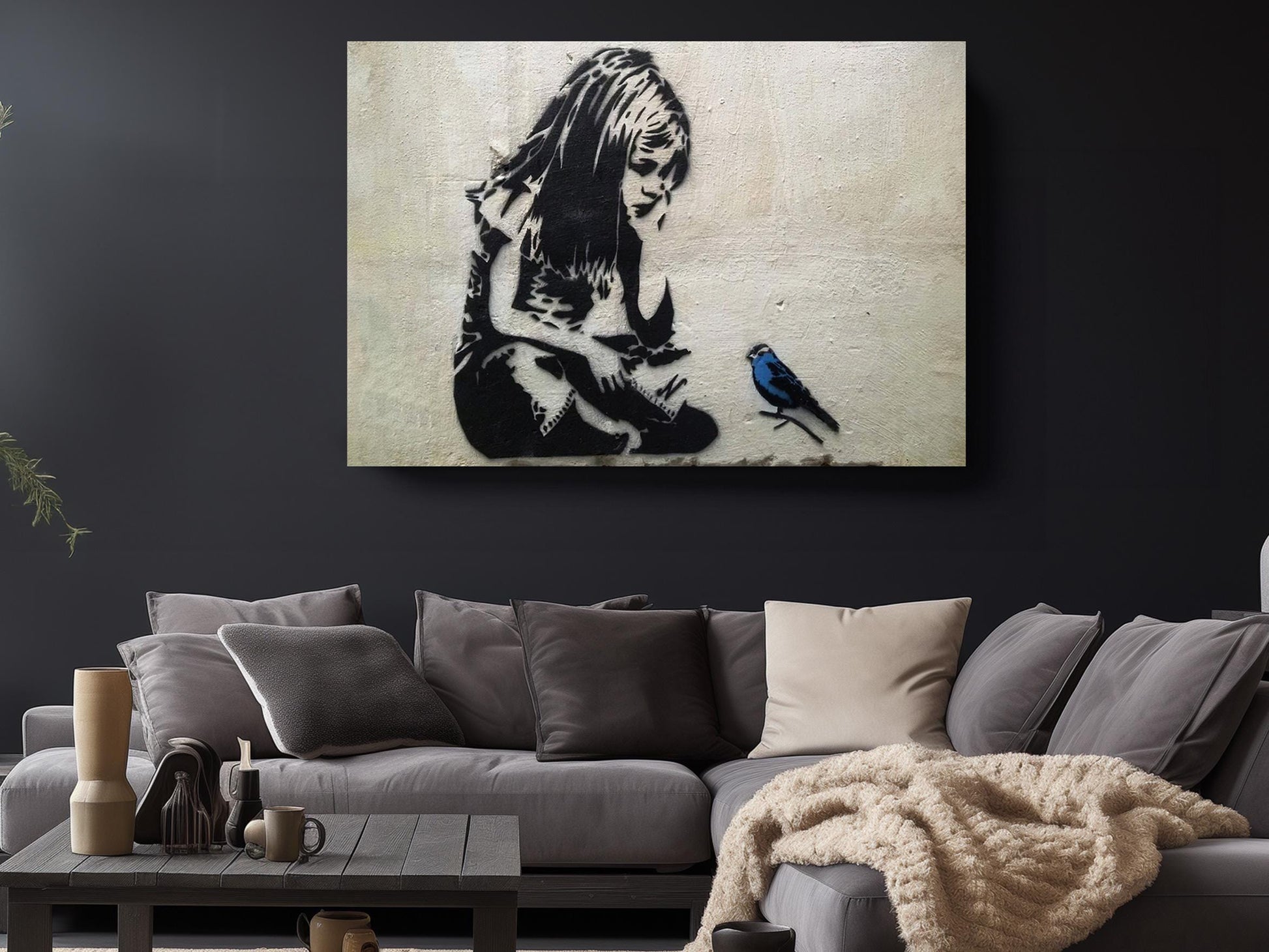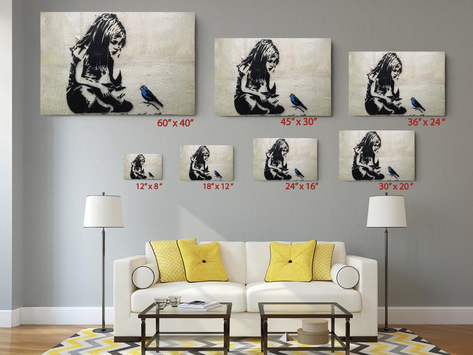 This blue bird graffiti print is available in two convenient formats to suit your display needs: