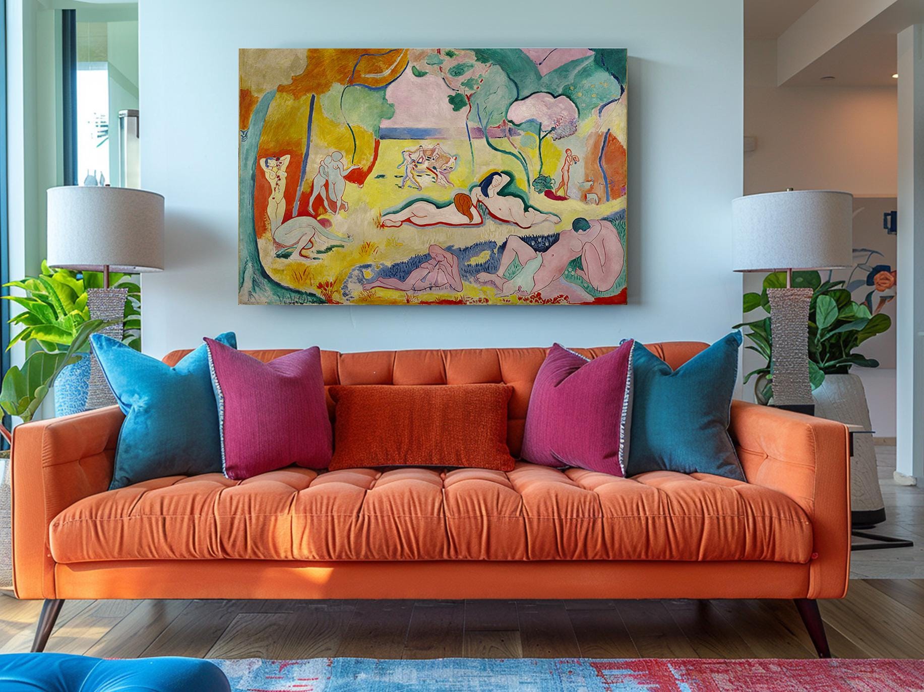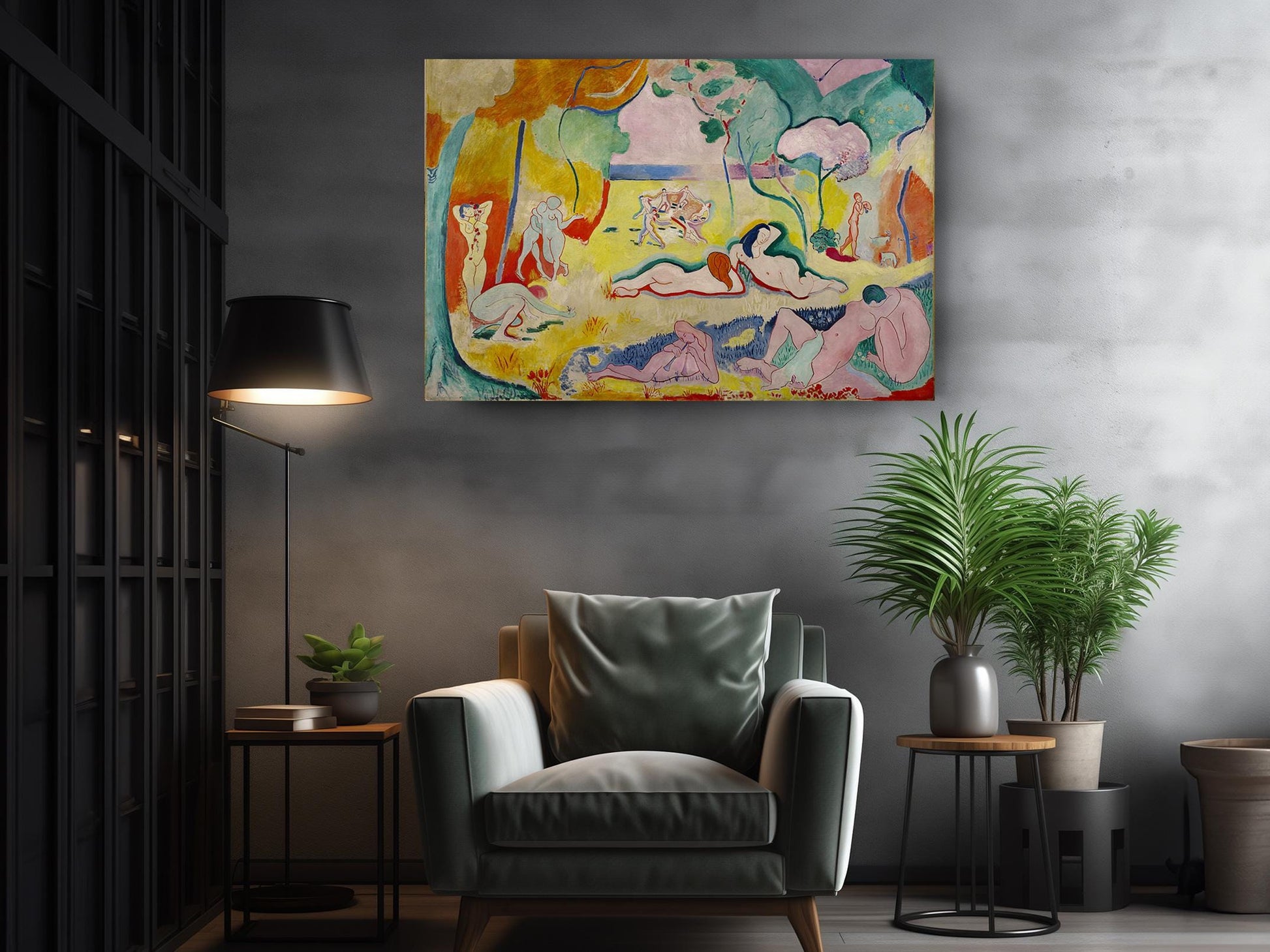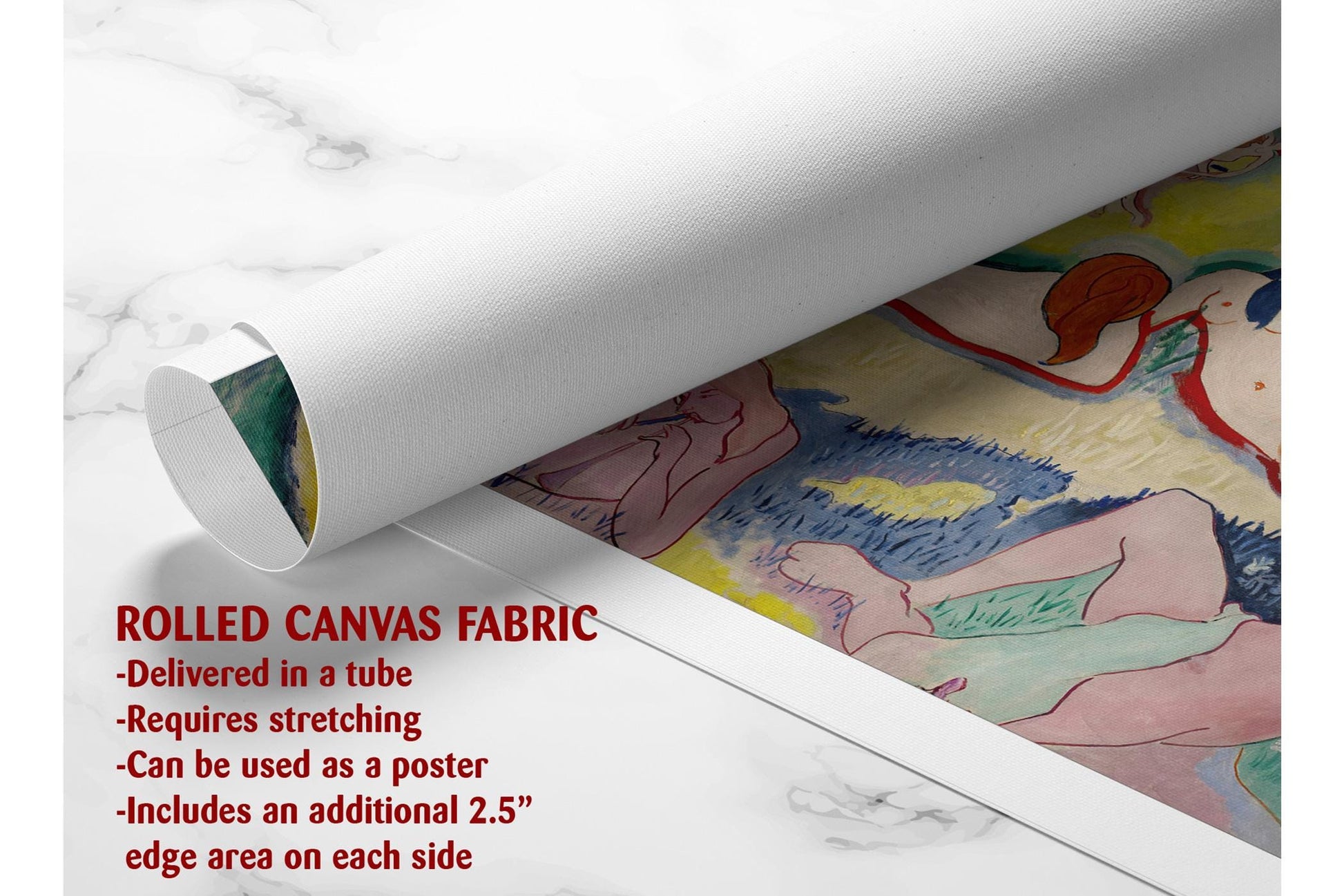 The Matisse canvas print captures the vibrant essence of Henri Matisse's masterpiece, 'Le Bonheur de Vivre,' bringing colorful wall art into your living space to uplift and inspire. This museum quality print uses pigment-based inks on artist grade canvas to deliver a fade resistant canvas and scratch resistant art that preserves the brilliance and detail of the original work over time. Choose between a rolled canvas print for custom framing or a ready to hang canvas pre-stretched on a solid wood frame for immediate display, making it perfect for collectors and modern art decor enthusiasts seeking sophistication and lasting quality.