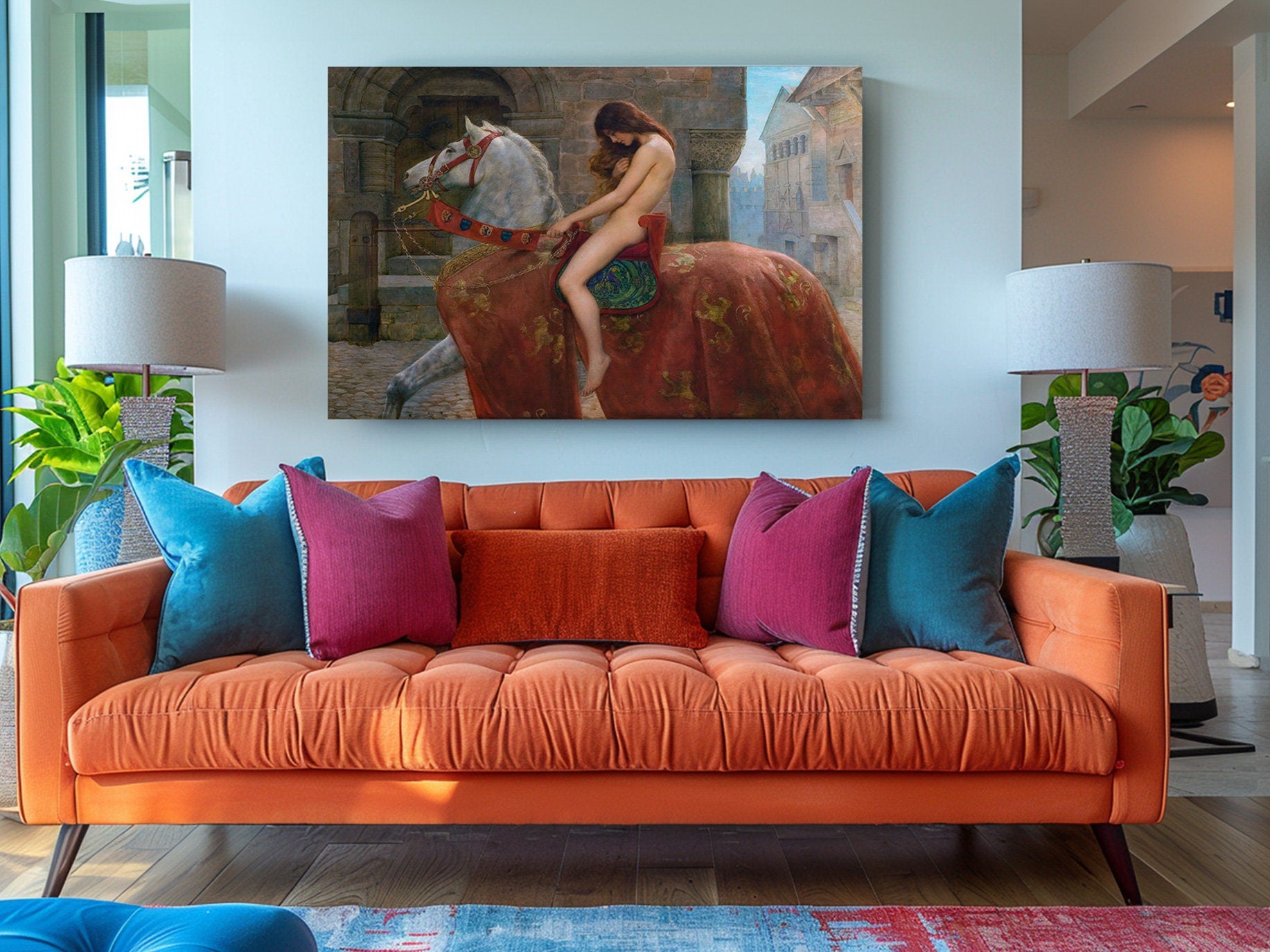The Lady Godiva painting by John Collier is a stunning museum quality canvas that brings classic art decor into your home with vibrant detail and historical significance. This Lady Godiva painting print offers a timeless art reproduction print that captures every brushstroke of the original masterpiece, providing an elegant focal point for any room. Printed using pigment-based inks on artist-grade canvas, this museum quality canvas ensures a fade resistant print that maintains its vivid colors for years.