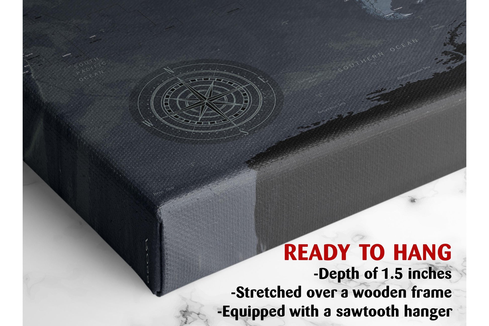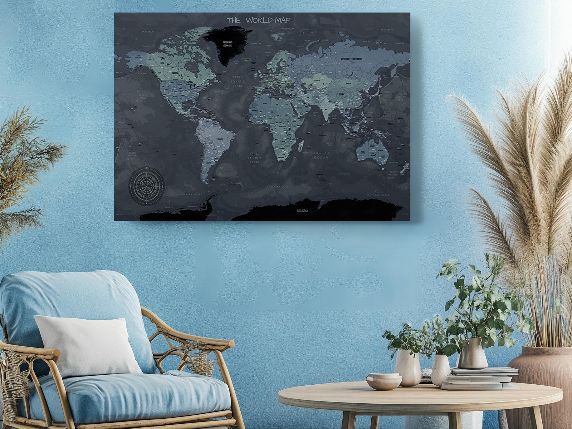 Our modern world map canvas offers a striking dark themed art piece designed to elevate any room with sophisticated map wall decor. This museum quality canvas print comes in two convenient formats to suit your style: a rolled canvas print shipped in a protective tube or a ready to hang art option pre-stretched on a solid wood frame. Crafted by Elite Canvas, this modern map artwork combines premium materials and precise printing technology to deliver lasting beauty and durability.