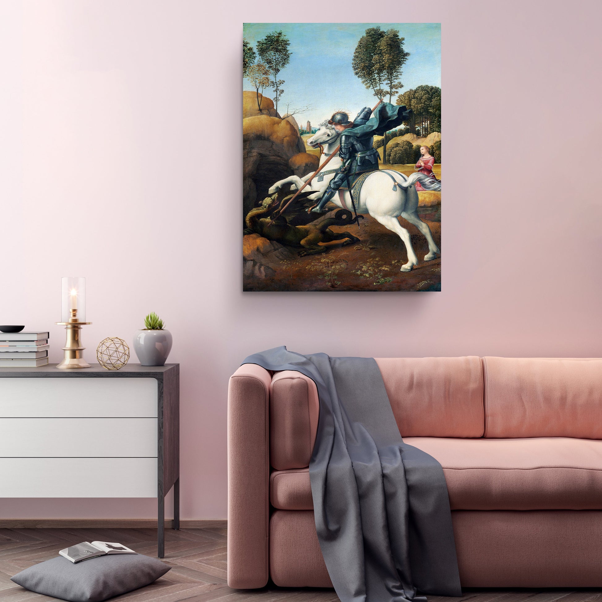 The Saint George canvas print brings classic war art into your home with museum quality canvas that captures every detail of this historic battle painting. This Saint George canvas print offers both rolled canvas prints and ready to hang art options, perfect for adding medieval wall decor or dragon art print themes to your space. Crafted by Elite Canvas, this artwork uses pigment-based inks on artist-grade canvas, ensuring a fade resistant canvas that preserves vivid colors and sharp details for years.