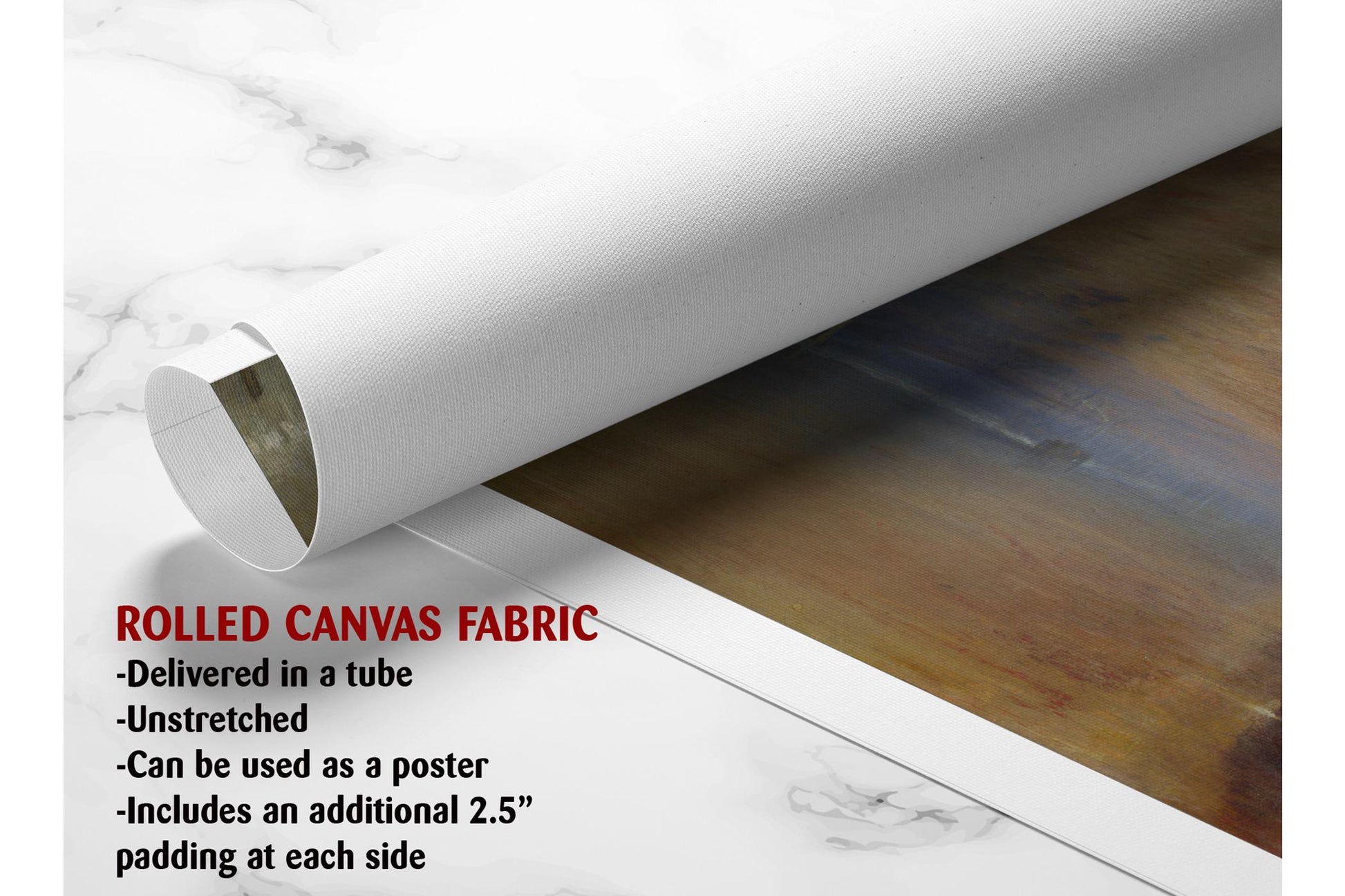 • Rolled canvas print shipped in a protective tube with a free 2.5-inch border, allowing you to stretch and frame it yourself.