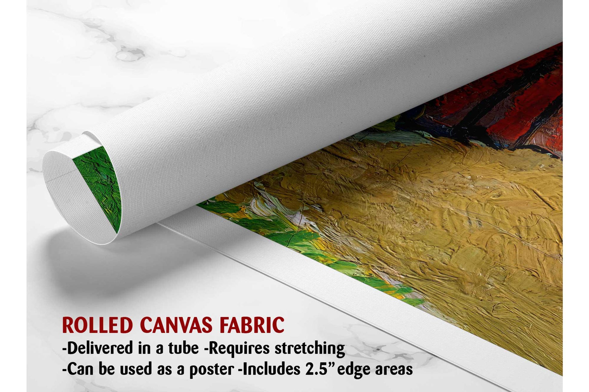 - Rolled canvas print shipped in a protective tube with a free 2.5" border, allowing you to stretch and frame it yourself