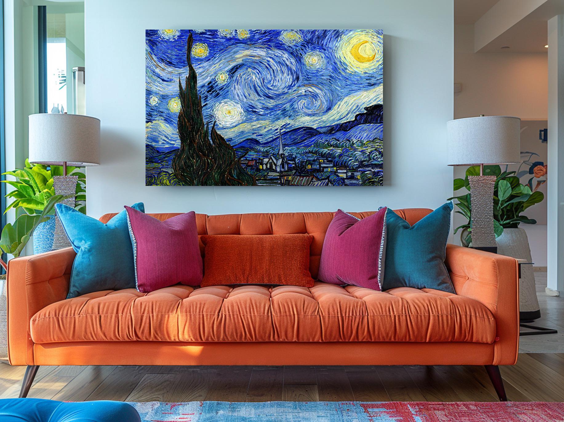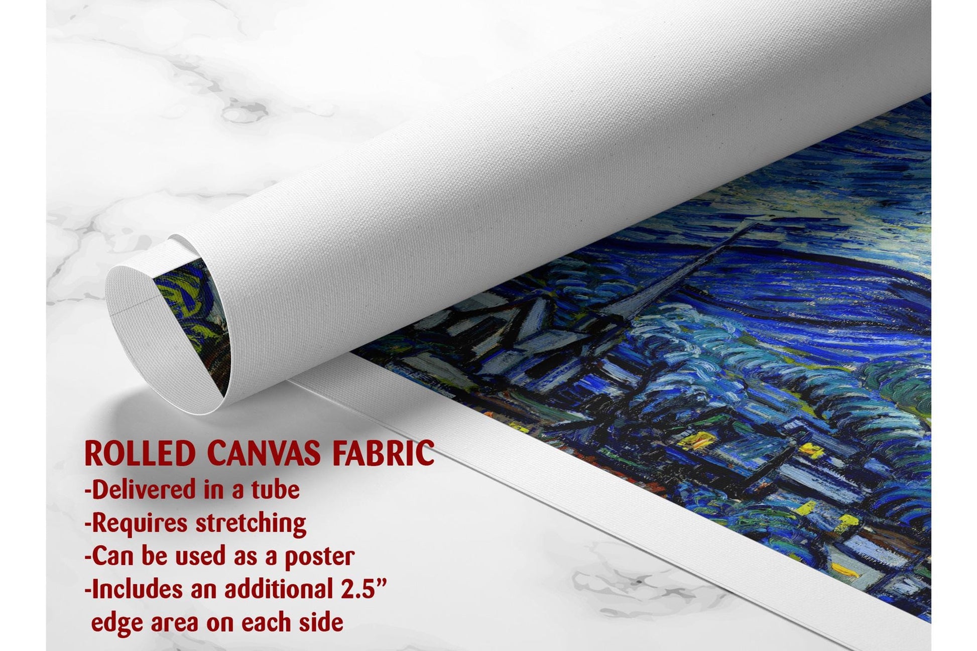The Starry Night canvas print brings Van Gogh's iconic masterpiece into your home with museum quality canvas that captures every swirling detail. This Starry Night canvas print uses pigment-based inks on artist grade canvas to deliver vibrant colors and a fade resistant canvas surface that lasts for years. Perfect for art lovers seeking classic art reproduction, this print is available in two convenient formats: a rolled canvas print shipped in a protective tube, or a ready to hang art option pre-stretched on a solid wood frame canvas for immediate display.